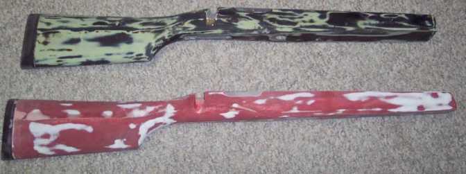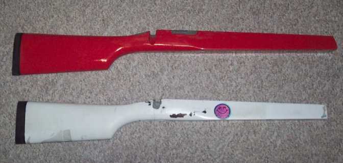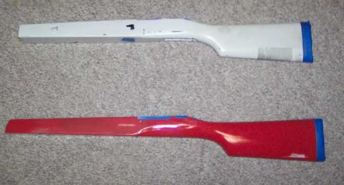 The stock that was white had couple of layers of white paint and what looks to be black primer. That is what you see in image above. The red stock has remnants of white/gray primer. Most of this remaining primer will come off as the parting lines and pin holes are filled and sanded.